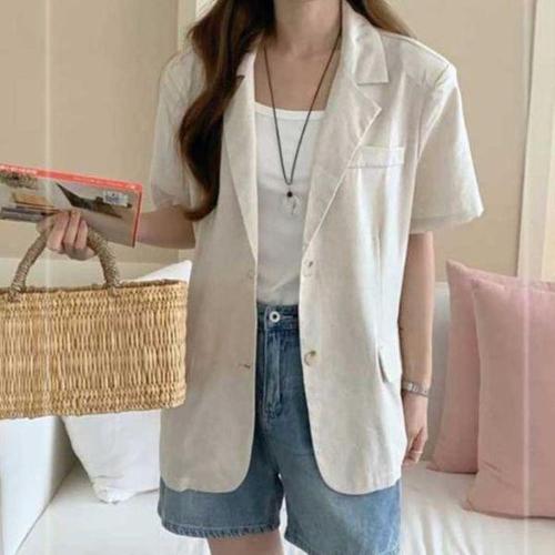 [신상오픈런]여성용 오버핏 반팔 자켓 카라넥 단추 디자인