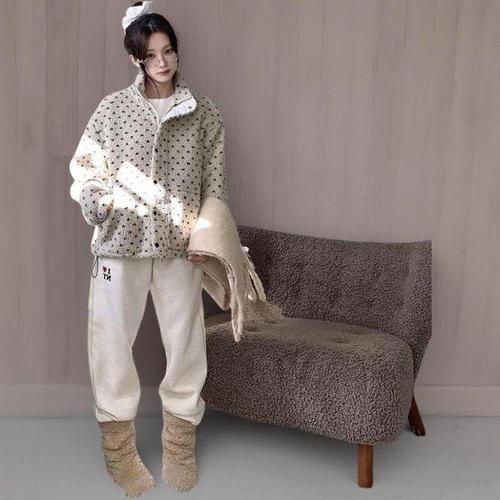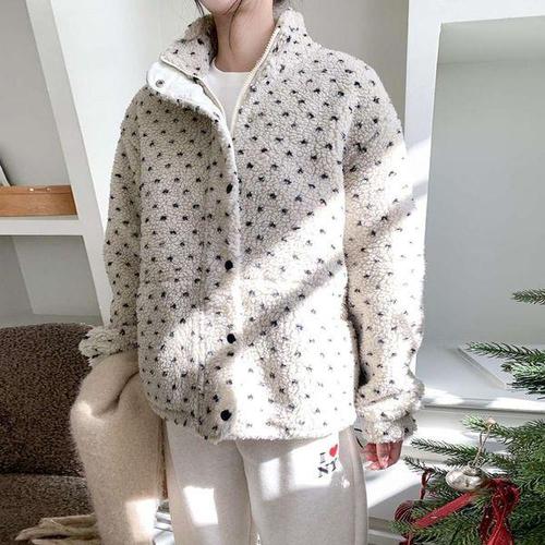 [신상오픈런]여성 도트 무늬 하이넥 퍼 양털 집업 재킷