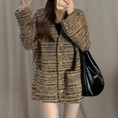 [신상오픈런]여성 금색 단추 포인트 브라운 트위드 자켓
