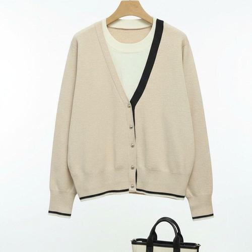 [미라클세븐]여성 루즈핏 레이온 혼합 배색 브이넥 니트 가디건