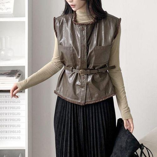 [신상오픈런]여성 가죽 자켓 수술 포켓 벨트 버튼 목폴라 세트