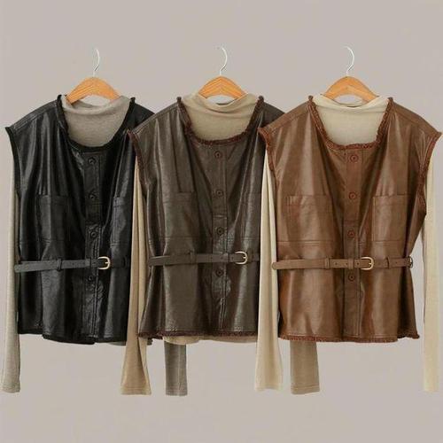 [신상오픈런]여성 가죽 재킷 포켓 벨트 버튼 목폴라 세트