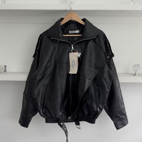[옷자락]여성 오버사이즈 가죽 자켓 벨트 포함 라이더 스타일 검정