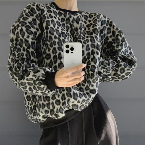 [옷자락] 여성 레오파드 패턴 오버사이즈 겨울 퍼 라운드넥 맨투맨