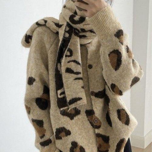 [페리엠]니트+머플러 세트 레오파드 무늬 웨슬리가디건