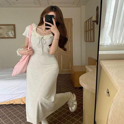 [에이치플러스몰]여성 러블리 레이스 프릴 U넥 롱 원피스 슬림핏