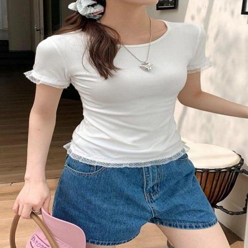 [오너클랜]인기상품 레이스 장식 여성용 반팔 라운드넥 티셔츠 여름용 [WFLKRH0_260303]