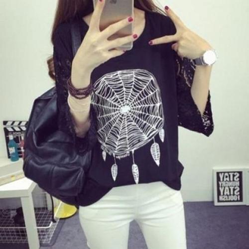 여자 밑단 레이스 슬림 화이트 반팔 티셔츠 URK-501