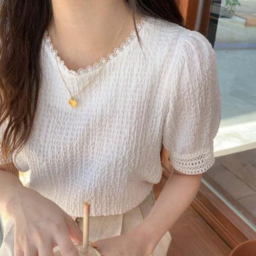 [오너클랜]인기상품 여성 라운드넥 와플 소재 레이스 반팔 블라우스 티셔츠 [WFLIOTX_260301]