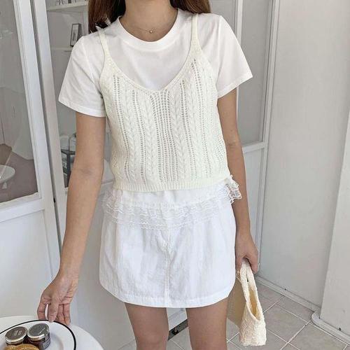 [옷자락] 여자 뜨개 니트 레이스 베스트 면 반팔티 세트