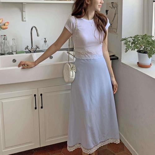[신상오픈런]여성 기본 컬러 레이스 프릴 롱 스커트 밴딩