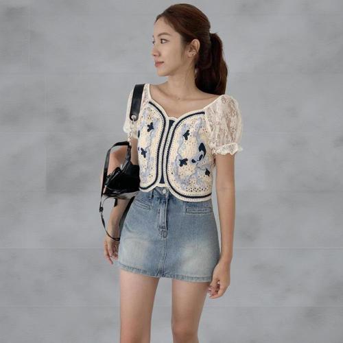 [옷자락] 여성 민속 스타일 니트 레이스 반소매 블라우스