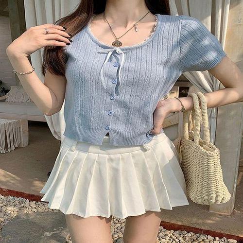 Vezri 라운드넥 레이스 반팔 니트 여성용 슬림핏 숏 기장 여름 상의