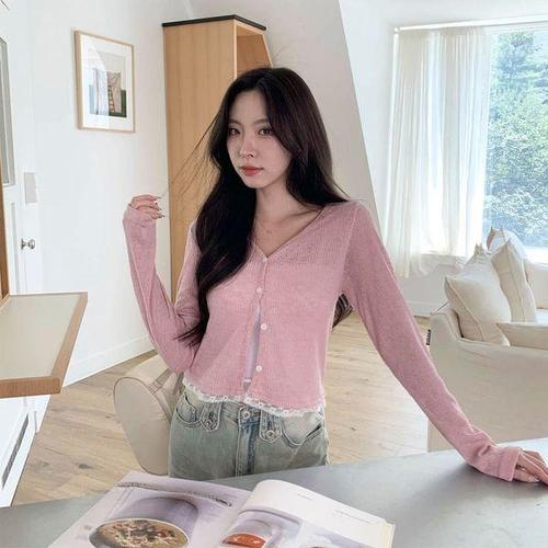 [신상오픈런]여성 골지 레이스 끝단 세미 시스루 긴팔 카디건