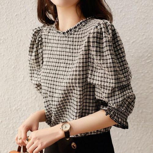 [에이비에프지]레이스 디테일 체크 패턴 반팔 블라우스 APZ3HB42H