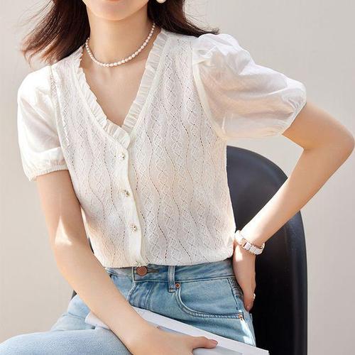 [에이치플러스몰]빅카라 레이스 퍼프소매 루즈핏 리본 반팔 블라우스