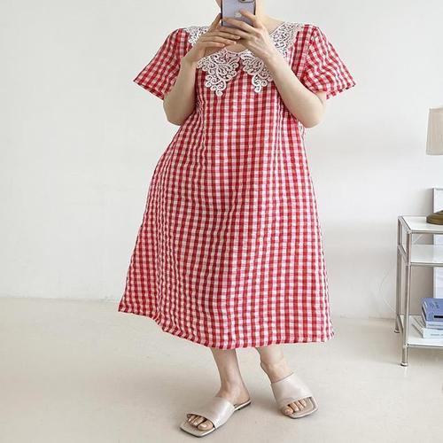 [다잇템]여자 카라 SS 색상 포인트 격자 레이스 원피스 (10419122A)