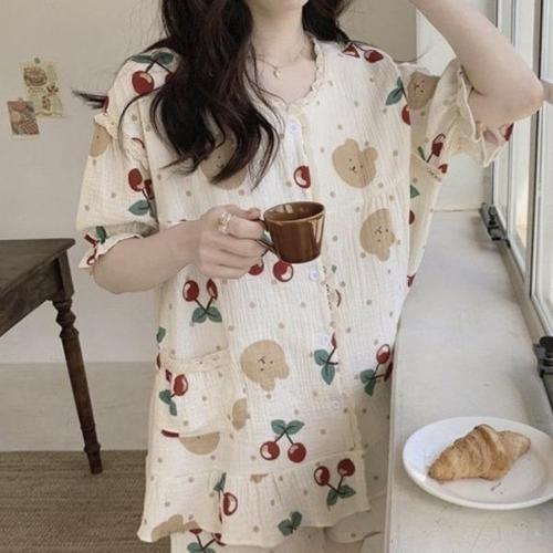 플랜트 크림 여성 잠옷 파자마 세트 여자 프릴 신상 레이스 홈웨어