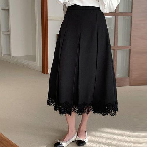 [삐까삐까]레이스 트리밍 핀턱 주름 롱 스커트 뒷밴딩 플레어 치마 고퀄리티 A라인 하객룩 격식룩
