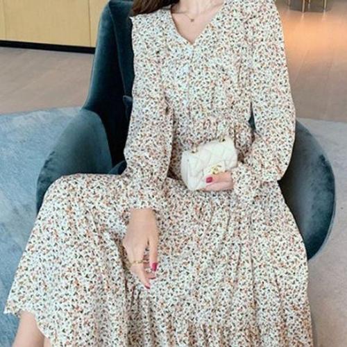 샵앤) 앞단추 카라넥 플레어 롱 원피스 CAT-WDR-3827-진베이지