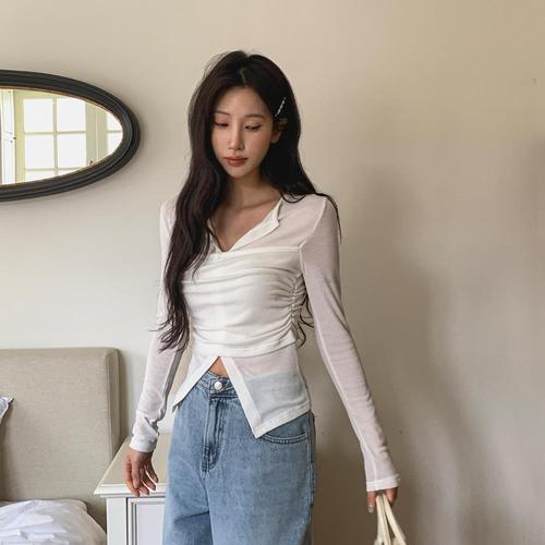 cammello 꾸안꾸 시스루 레이어드 슬림핏 셔링 티셔츠 여성 긴팔티