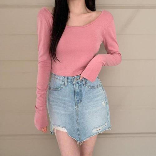 [신상오픈런]여성 심플 레이온 스판 골지 유넥 크롭 긴팔티셔츠