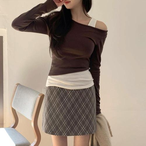 [옷자락] 여성 레이온 스판 어깨트임 언발 레이어드 긴팔티