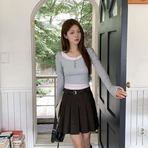 [옷자락] 여자 레이온 스판 레이어드 단추 슬림핏 유넥 긴팔티