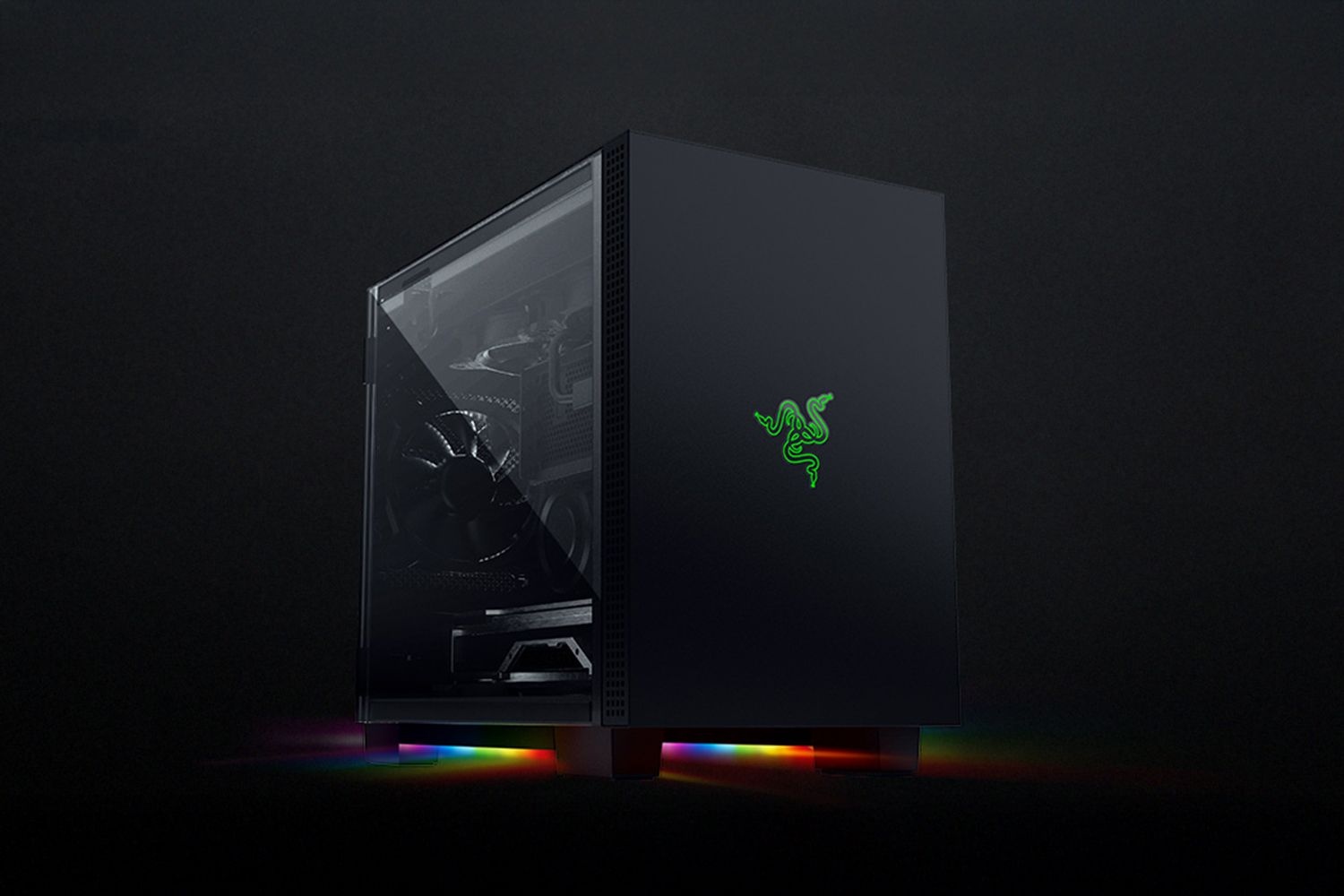 Razer Tomahawk Mini-ITX 게이밍 케이스 양면 강화 유리 회전 도어 통풍 상단 패널 Chroma RGB 언더글로우 조명 내장 케이블 관리 클래식 블랙