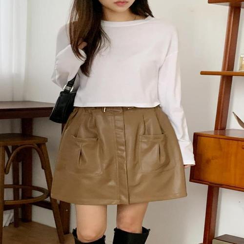 미즈큐즈 / 레더 레자 가죽 포켓 밴딩 A라인 치마 플레어 롱 스커