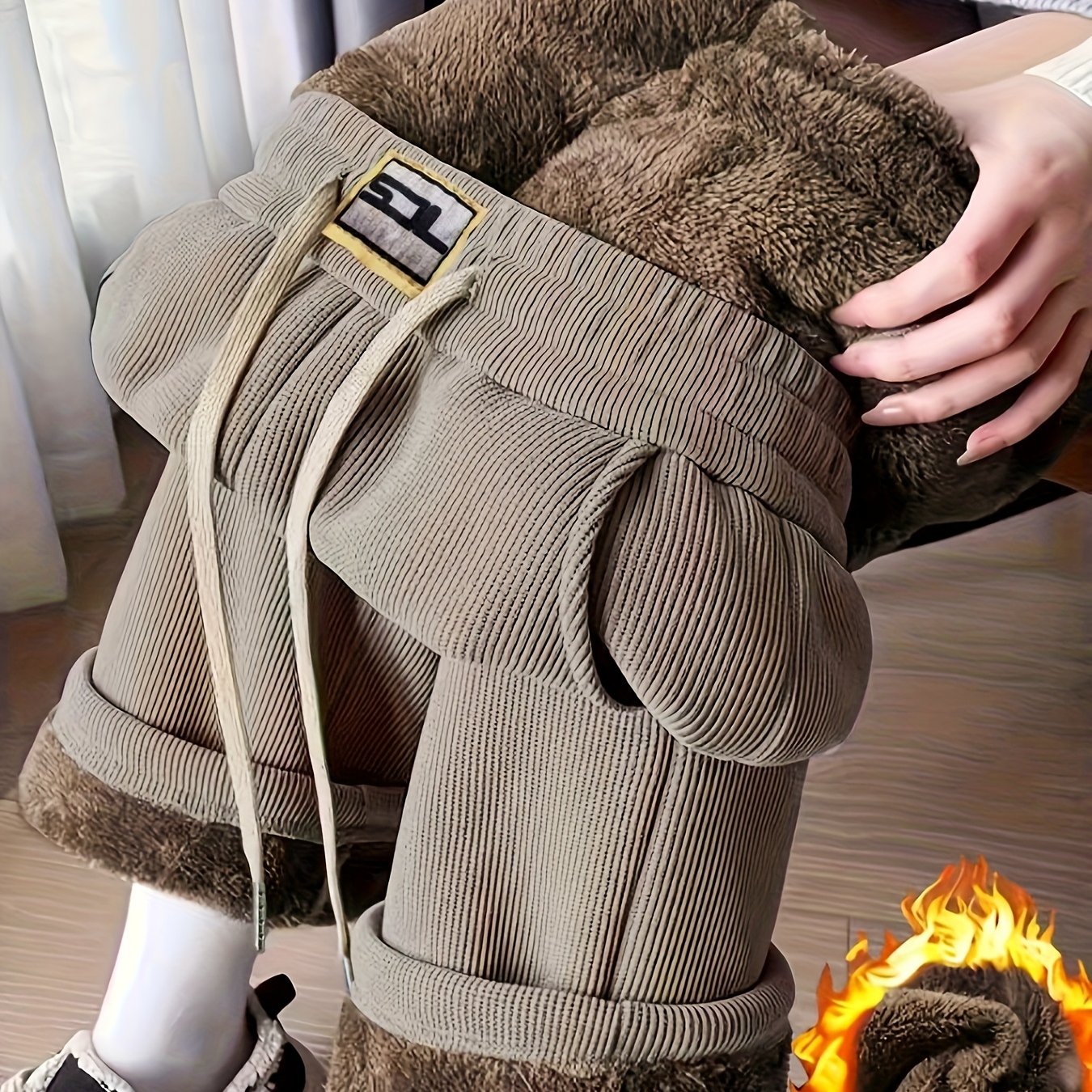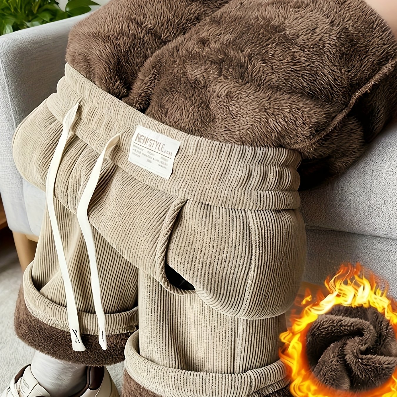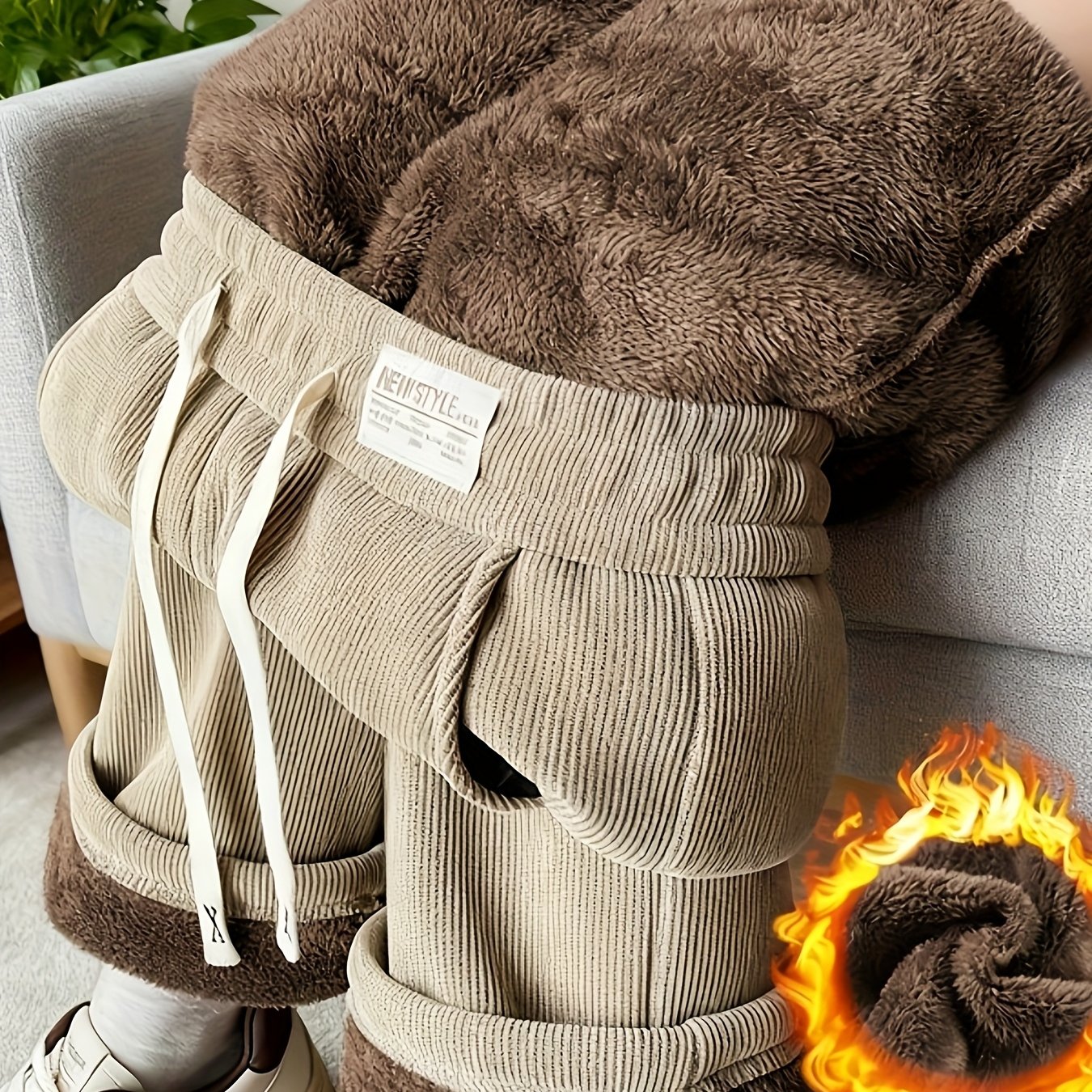 TEMU 여성용 두꺼운 퍼지 와이드 레그 팬츠 - 드로스트링 허리 가는 겨울 따뜻한 바지, 브라운레드/ - 캐주얼