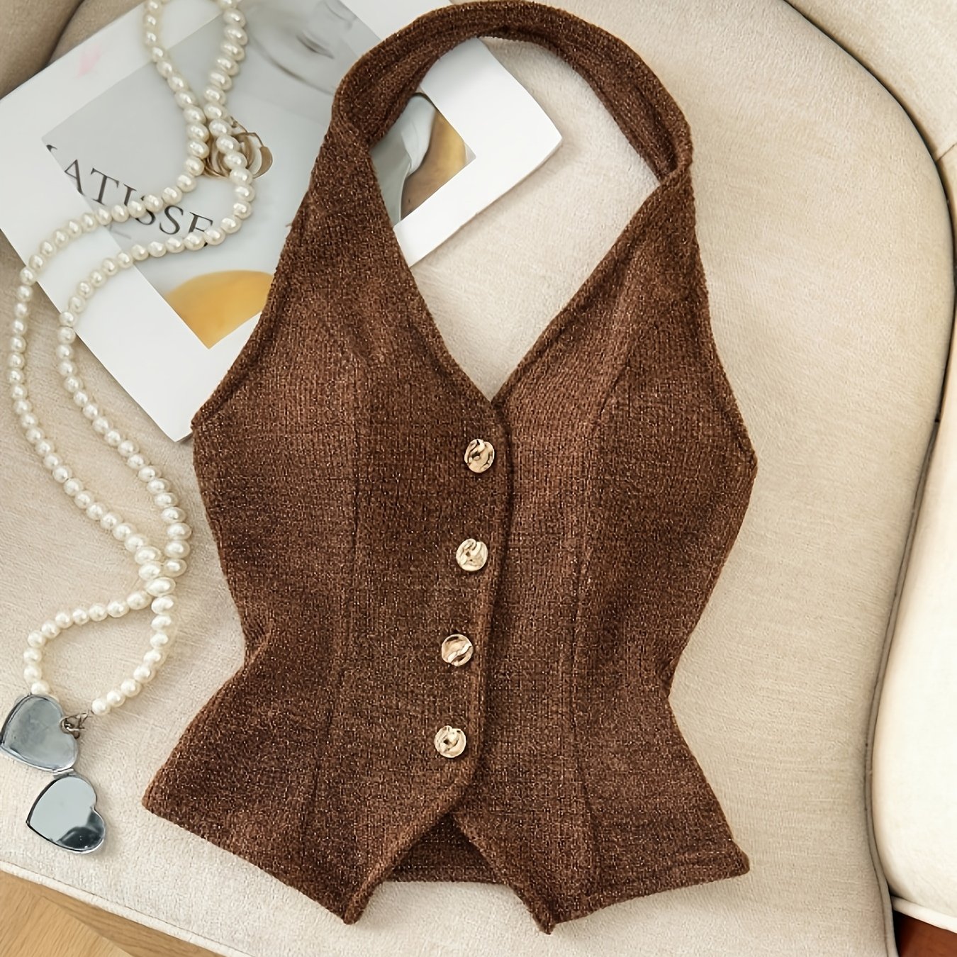 TEMU 여성용 홀터넥 민소매 버튼프론트 탑, 뒷지퍼 & 허리끈 - 슬림핏 스트레치 브라운셔츠, 세탁기 사용 가능 사계절 캐주얼부터 반정장까지 착용 가능한 민소매 하이넥 캐주얼 피트 상의