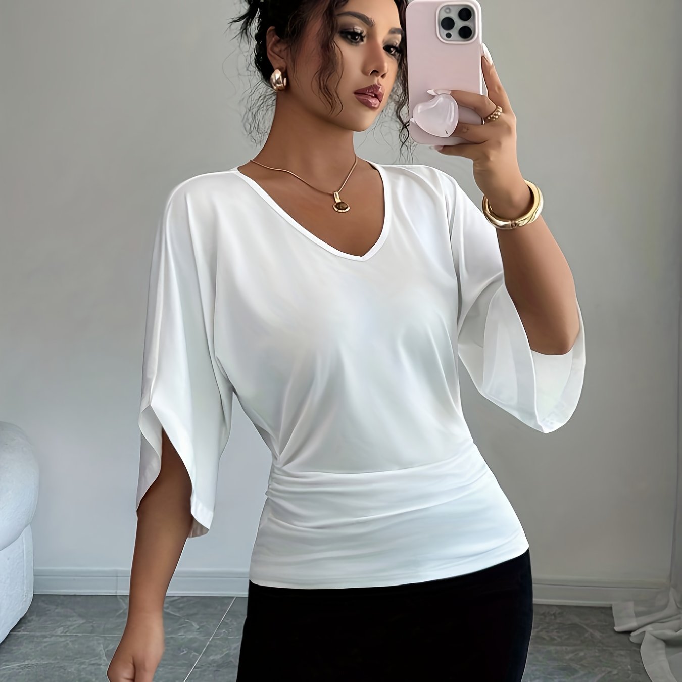 TEMU 여성용 캐주얼 솔리드 컬러 타이 커프 플레어 소매 셔츠 V넥 탑