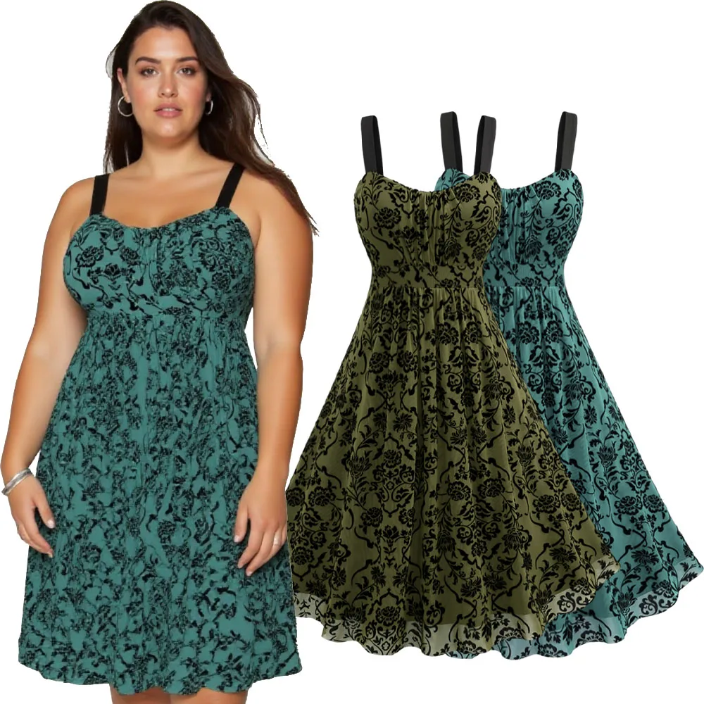 로즈갈 플러스 사이즈 여성 캐주얼 드레스 빈티지 민소매 플라워 레이어드 러치드 메쉬 A라인 드레스