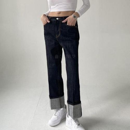 예니브 여성용 봄가을용 청바지 밑단 롤업 와이드 팬츠 9부 바지