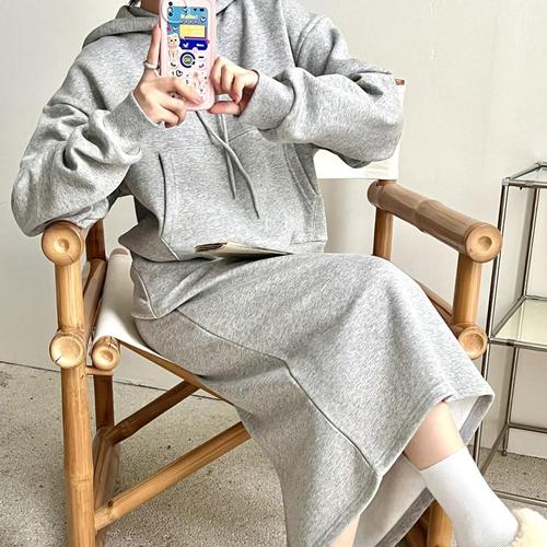 [샵앤][샵앤] 국산 여성 기모 후드 티셔츠 롱스커트 셋업 LL-WSET-5008-멜란지