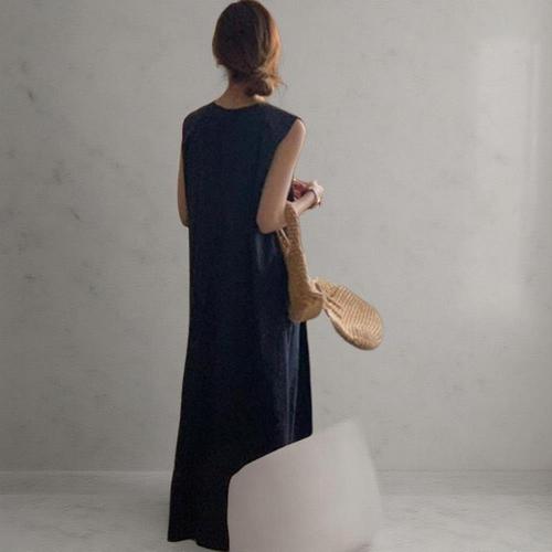 [옷자락]여성 바스락 라운드넥 민소매 플레어 롱 드레스