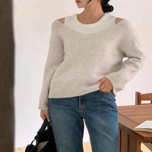 [다잇템]여성 롱슬리브 트임 슬리브리스 V넥 코디 니트