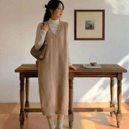 여자 레이어드 양트임 박시 브이넥 니트조끼 롱원피스