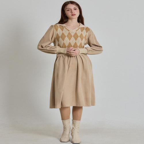 [오조크][오조크(OZOC)] 아가일 니트 베스트 레이어드 롱 원피스 (택가격 124000원)