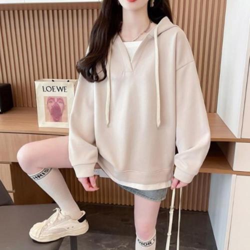[미라클세븐]여성 연한 베이지 색상 후드 롱 티셔츠 루즈핏 맨투맨