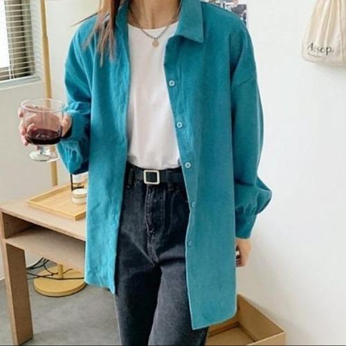 커플티 캐주얼 남녀공용 빅사이즈 루즈핏 코르덴 긴팔셔츠 롱셔츠 외의셔츠 남방셔츠 단색 심플 오버핏