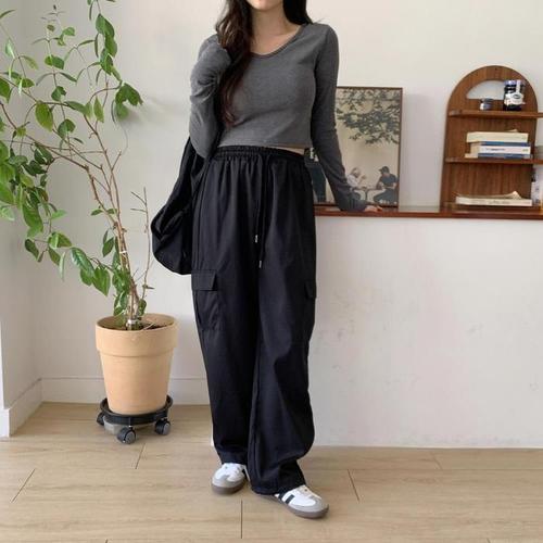 [다잇템]여자 롱슬리브 핸드 V넥 워머티 슬림 티셔츠 (11098879A)