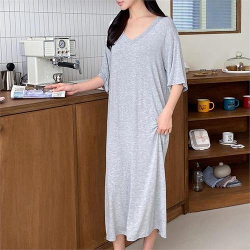 [다잇템]여자 소프트핏 V넥 반소매 편한 롱원피스 (8189836A)