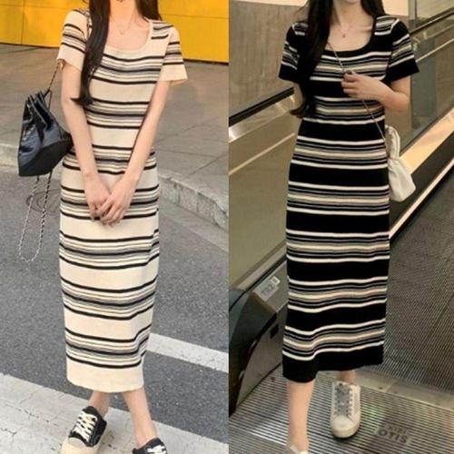 [오너클랜]인기상품 여성용 스트라이프 롱 드레스 스퀘어넥 데일리 원피스 [WFLL86S_260304]