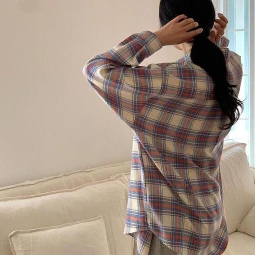 [옷자락]여자 클래식 도톰 배색 체크 루즈핏 롱 남방