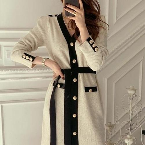 여성 롱 니트 조끼 원피스 여성 가을 겨울 V넥 루즈핏 롱 버튼 니트 원피스 LCL