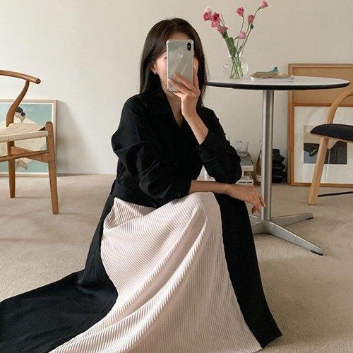 [옷은날개] 클래식 우아함 브이넥 플리츠 롱 A라인 원피스