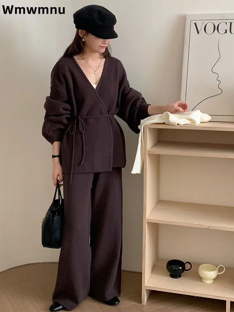 V넥 캐주얼 니트 스웨터 투피스 세트 우아한 레이스업 가디건 탑 콘준토 여성 루즈핏 하이웨이스트 와이드 레그 앙상블