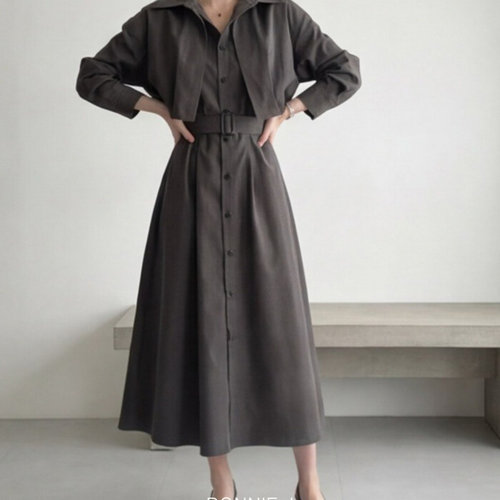 보니제이 / 2WAY 탈부착 케이프 빅카라 핀턱 셔링 롱 원피스 루즈